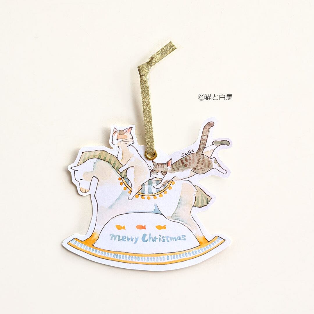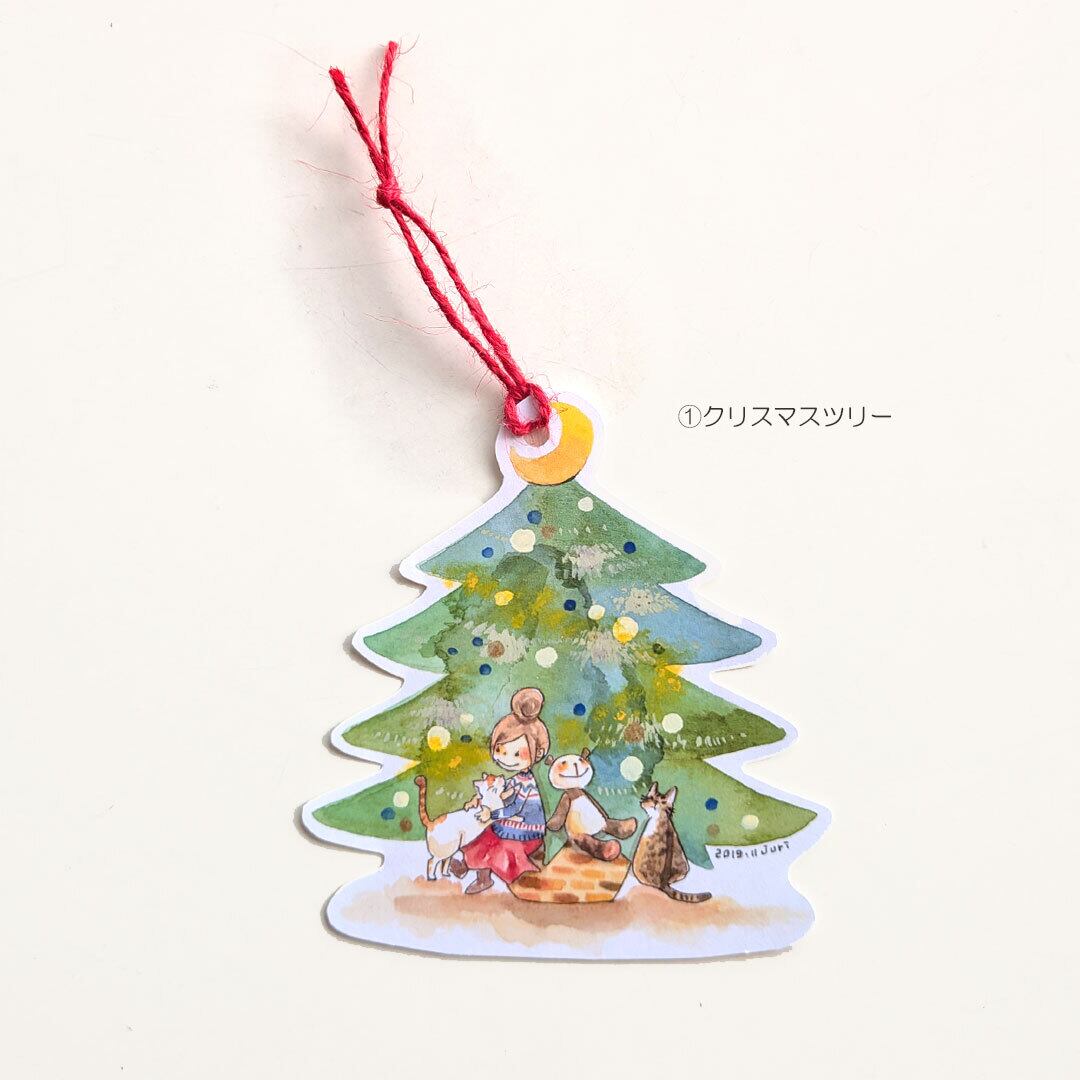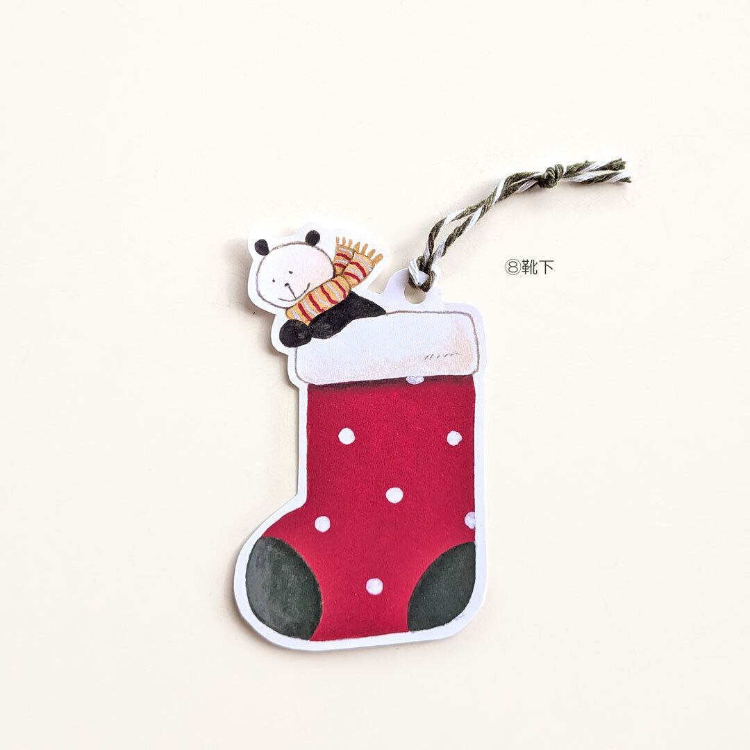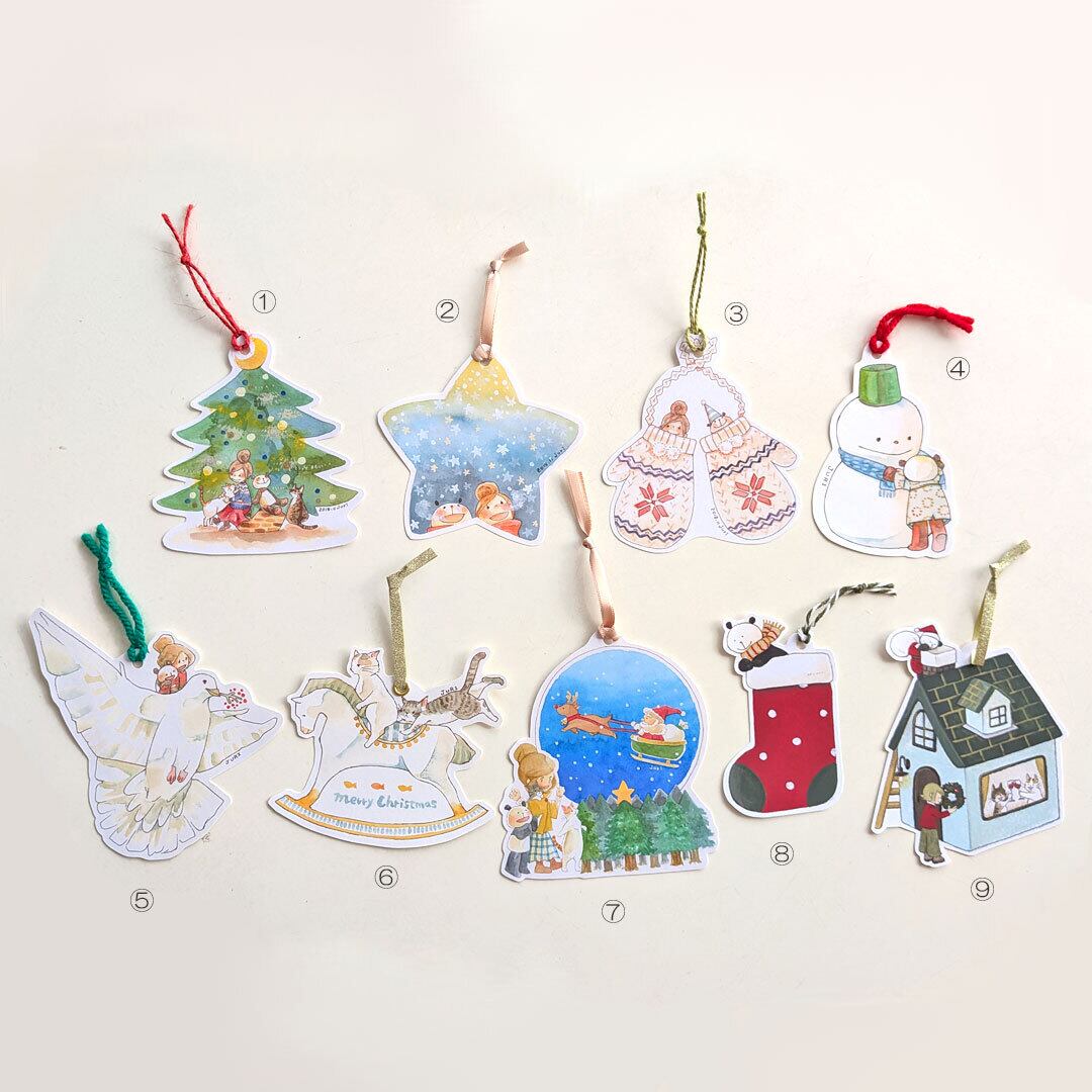 ダイカットカードにクリスマスらしいカラーのリボンや紐がついています。
