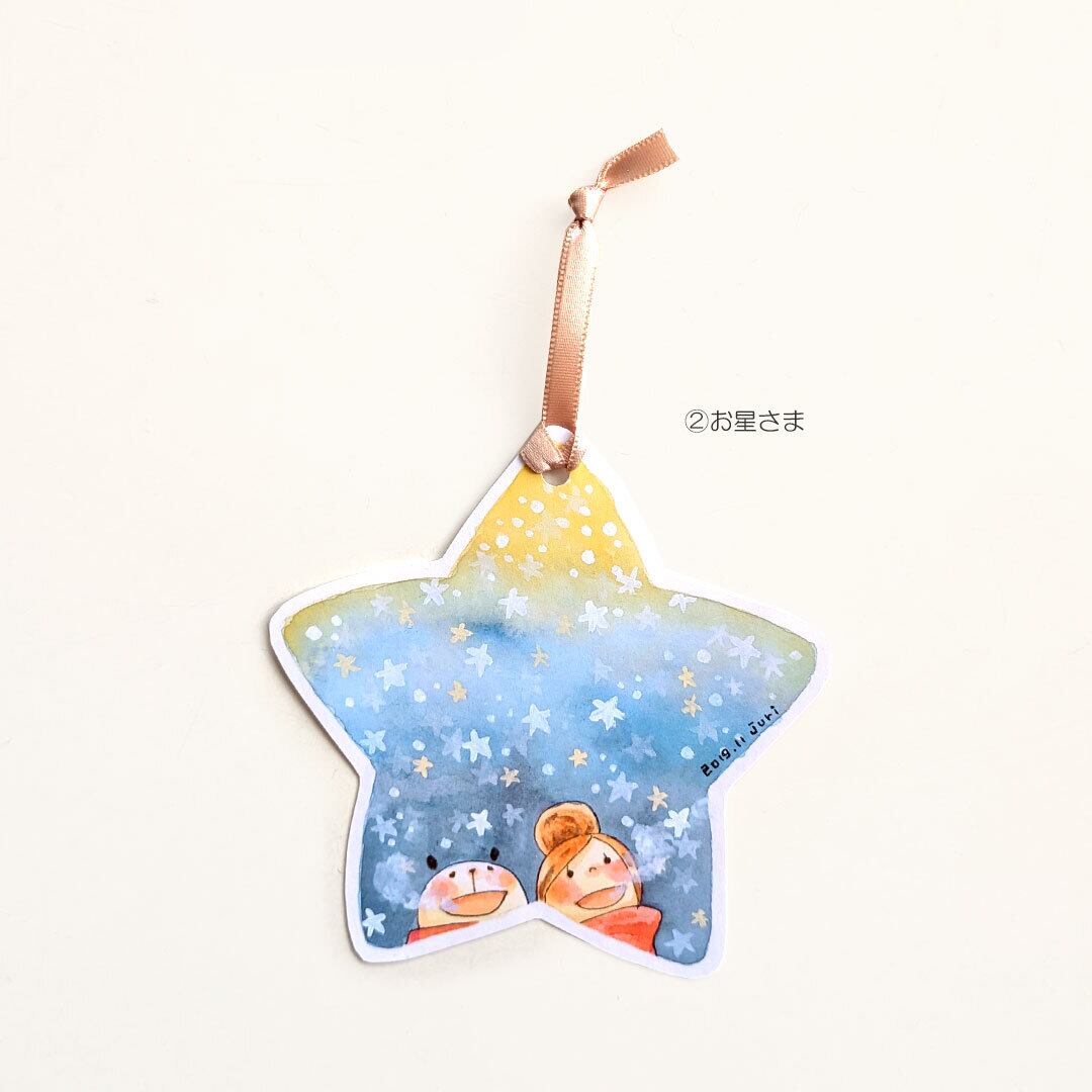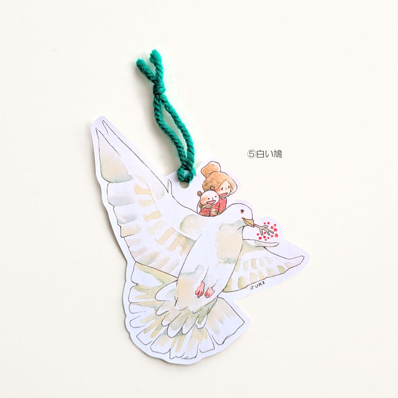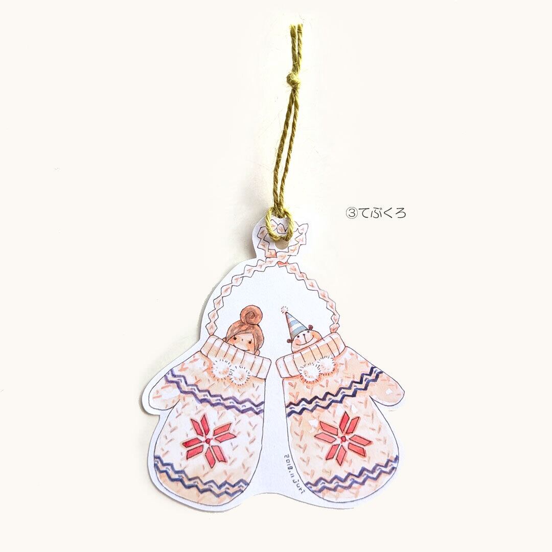 ダイカットカードにクリスマスらしいカラーのリボンや紐がついています。